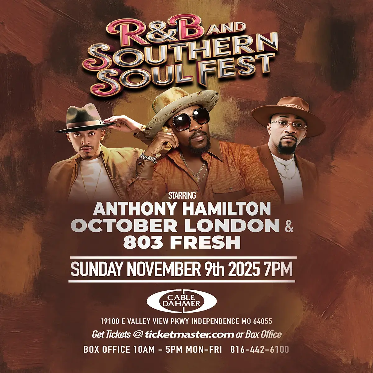 Kansas City, get ready for Grammy award winning artist Anthony Hamilton, and smooth R&B artist October London in concert at the Cable Dahmer arena on November 9th with special guest Mr. Southern Soul Boots on the Ground
